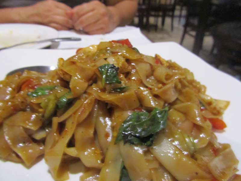 Drunken Noodles with chicken. Just went to Sue's Kitchen last night (10/8), the cuisine exalted, the hospitable family vibe still the golden x-factor. The key to their Drunken Noodle dish is the precise interplay of chile, basil and the sauce with the char on the red bells, onions and noodles.